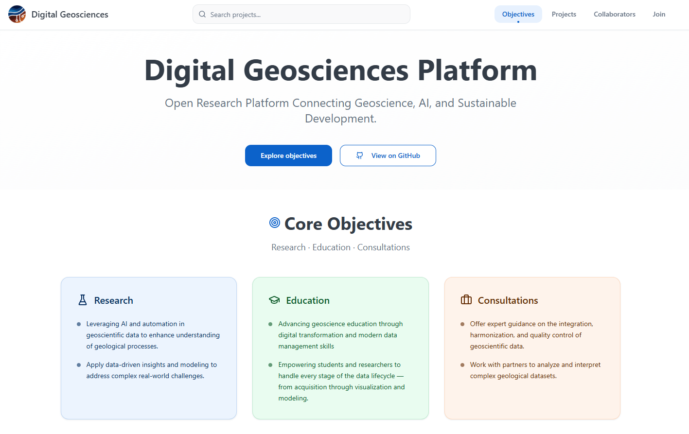 Digital Geosciences Platform has been created to address this challenge. It connects geoscience, artificial intelligence (AI), and sustainable development within a unified framework that allows researchers, educators, and consultants to seamlessly move from data acquisition to modeling and visualization. The platform is designed to transform geological data into actionable knowledge, empowering users to contribute, collaborate, and innovate.